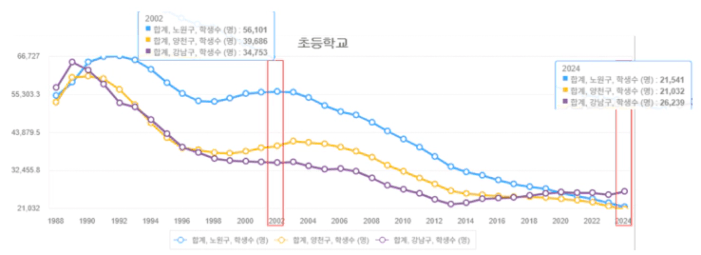 노원구의 학생수가 급격하게 줄고 있습니다.