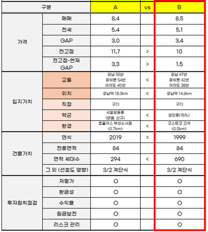 → A단지가 2019년식이라 연식이 압도적으로 좋은 부분이 있으나 구로 내에서도 신혼부부 외에는 비수요 생활권이라고 할 수 있는 항동 생활권 단지이기에, 전고점이 더 낮더라도 사람들이 더 많이 선호하고 환금성이 높은 B단지에 투자하는 것이 맞을 것 같다. 더 벌지는 못하더라도 더 안전한 자산에 투자해서 망하지 않는 것이 중요하다는 것을 잊지 말자.