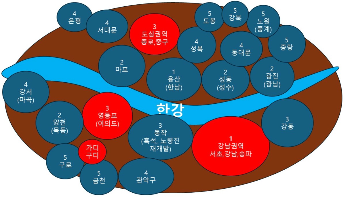 이번 강의에서 서울 25개구 급지/입지별 특징 한 판 정리로 각 구에서 중요한 요소가 무엇인지 알 수 있었고 서울의 핵심은 강남과의 교통이다.