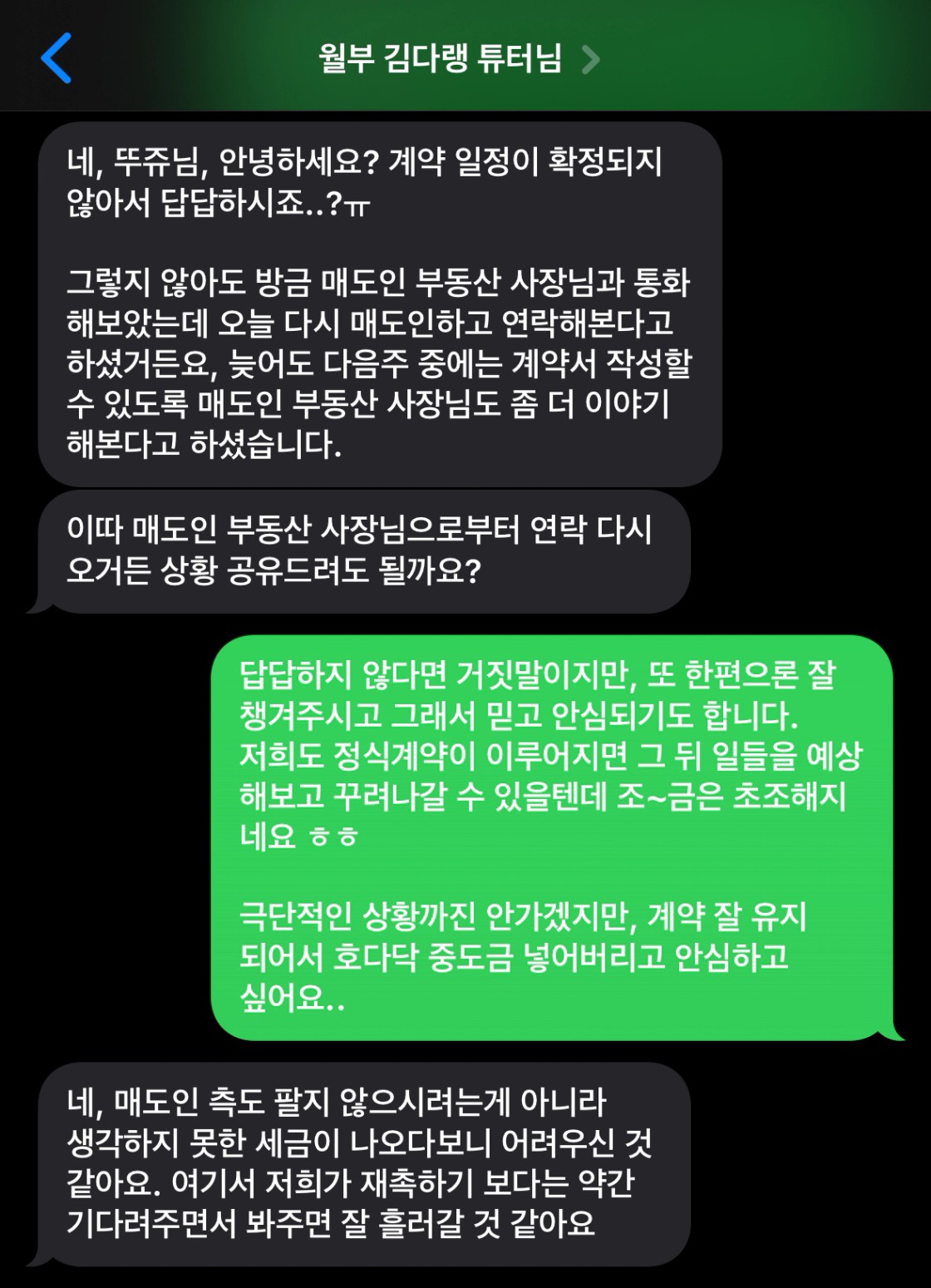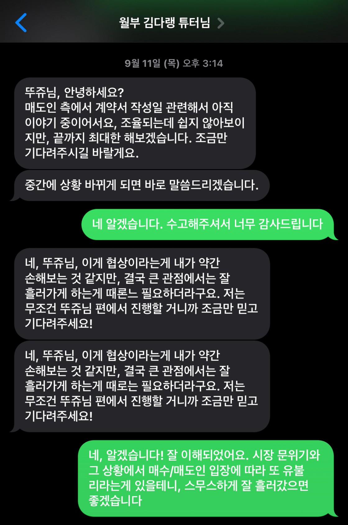 자꾸만 협상하는 방향이 바뀌는 매도인으로 지쳐갈 때 쯤, 흔들리는 저희 멘탈을 정말 굳건히 지켜주셨던 다랭 튜터님께 이 자리를 빌어 감사하다는 말씀을 드리고 싶습니다.