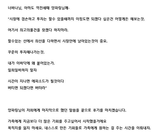 BM.제가 어쩌면 누군가를 도울수 있다는 너무 건방진 마음이지 않을까. 너무 쉽게 다가가고 상대방을 정말 위한 방법이 맞나? 반성하는 계기가 되었어요. 투자공부한지 오래되었다는 생각을 단 한번도 한적이 없었는데 오늘 덜컥. 앞마당이 많으시네요~라는 말씀을 듣고 늘 방방거리며 경솔했던 제가 쿡 찔리더라구요. 신중하며, 역지사지 할수 있는 동료가 될수 있도록 저도 노력하겠습니다