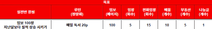 임보는 지난달보다 20% 양적 상승인 120장을 목표로 했었으나, 튜터님과의 통화 후, 장수는 지난달과 마찬가지로 100장 유지 및 지난달에 썼던 장표에서 BM하고 싶었던 것들 적용하면서 질적으로 업그레이드 하는 것으로 수정!