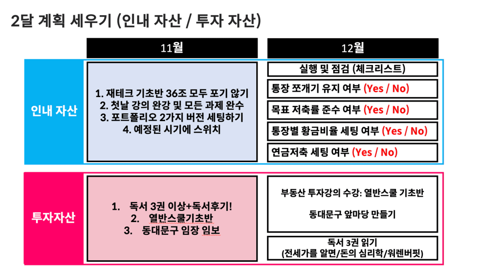 - 1주차에는 시나리오별 포트폴리오를 2가지 계획하고, 통장쪼개기+카드연동 및 이체설정까지 완료한다.