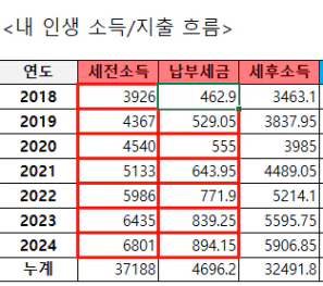 납부세금, 세후소득이 자동으로 계산되는 엑셀식이예요