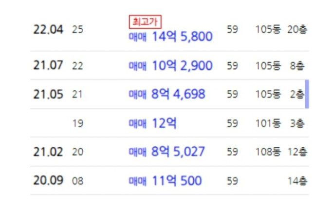 이런 경우, 전고점이 14.58억에 찍혀있긴 하지만 이 가격이 시장에서 일반적으로 받아들여지는 유의미한 가격이라고 보기 어렵습니다. 실제로 주변 단지들의 전고점을 보면