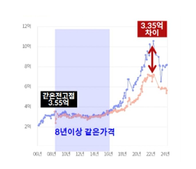하지만 두 단지는 그 다음 상승장에서 점점 가격차이를 벌려가더니 결국 2021년 전고점 기준 3.35억 차이가 나는 모습을 보였습니다.