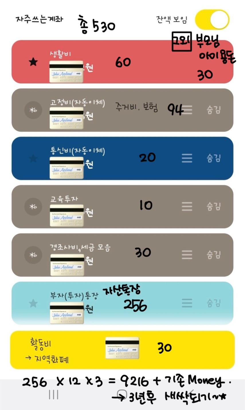 몇 해전 관련 책을 읽고 신용카드를 없애고 통장을 쪼개고 체크 카드만 쓰기 시작했다. 그런데 꺼낼 수 없는 통장에 저축을 하는 게 불안해서 저축은 조금만 하고 나머지는 명목 상 쪼개두고 그 안에서 돌려 막기를 하게 되는 생활을 하고 있던 차에 월부를 만났고 다시 한번 마음을 다잡고 모으는 통장에 열심히 넣고 없으면 안 쓴다는 마음으로!!! 이번엔 잘 해보자~!!!!!!!