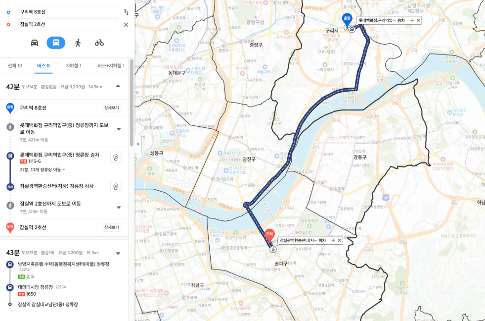 구리역에서 버스를 타고 잠실역으로 이동 후