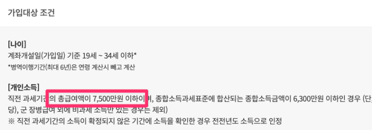 당장 청년도약계좌의 조건만 봐도 총급여 7,500만원 이하로 적혀 있어요.
