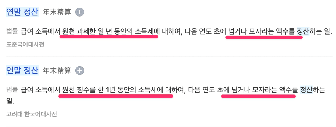 이렇게 한자를 알고 국어사전을 보면 연말정산은 아래와 같이 풀이가 돼요.