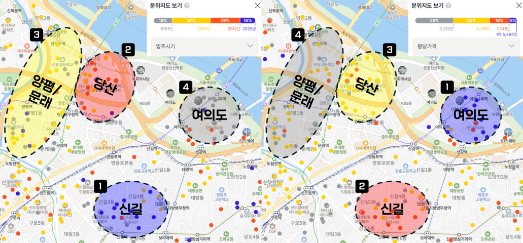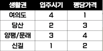 그 다음으로 “당산”과 “신길” 생활권의 선호도를 생각해보면,
