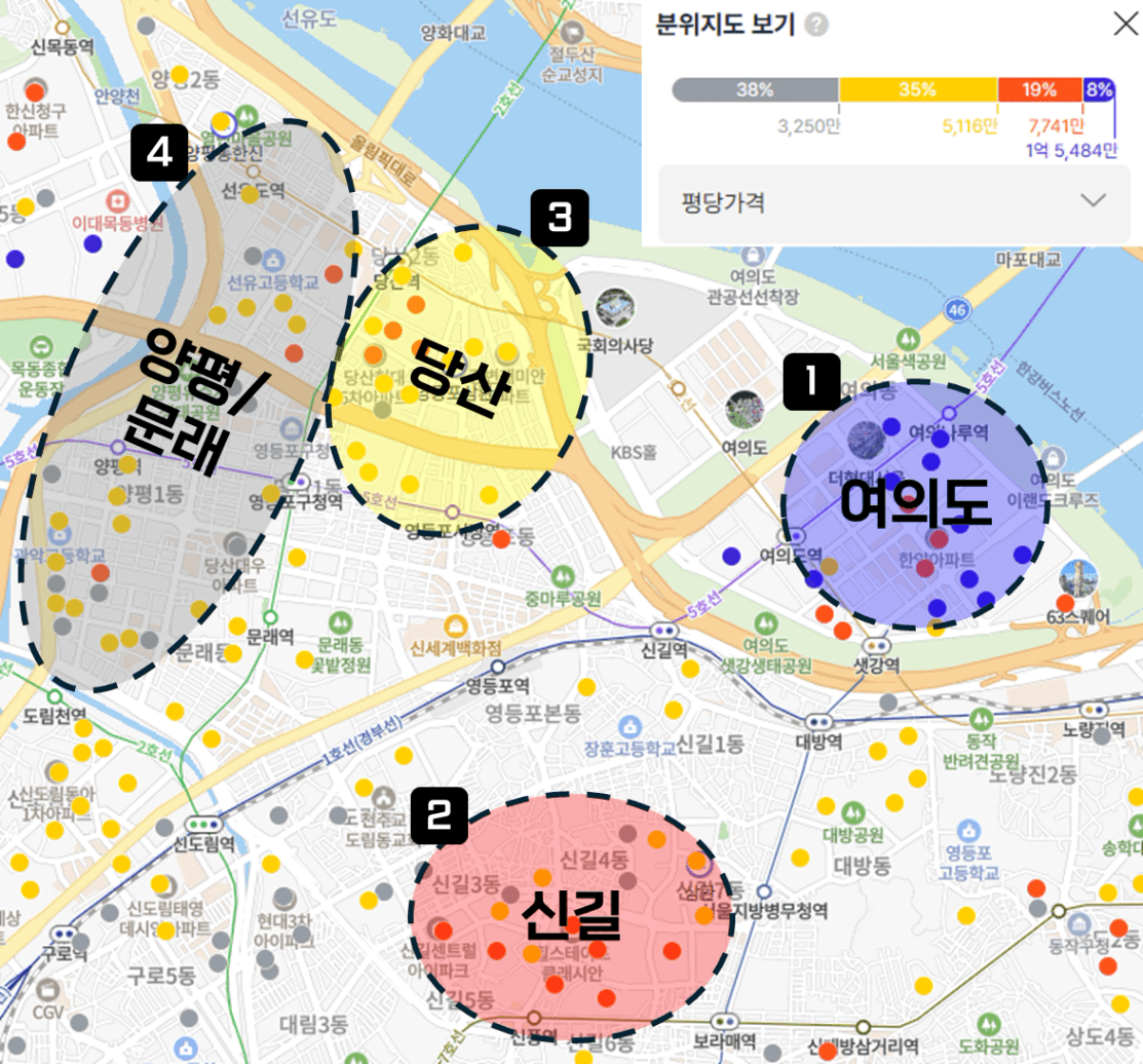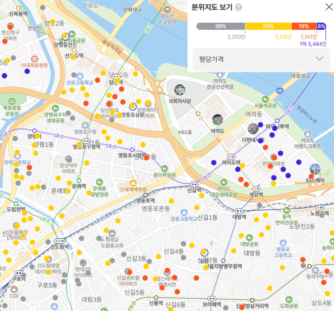 평당가격 분위지도를 캡쳐해 가져옵니다.
