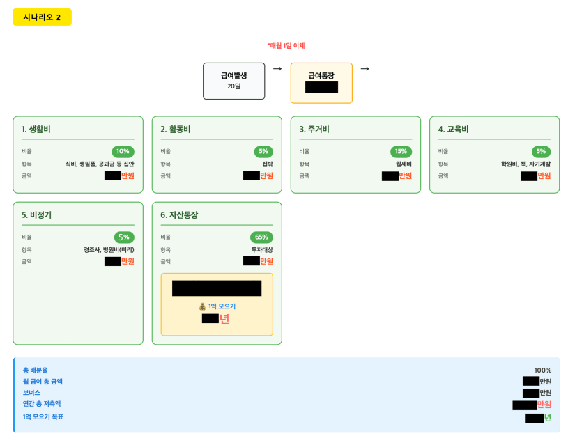 생활비 10%, 주거비 15%, 교육비 5%, 비정기 5%, 자산통장 65%.