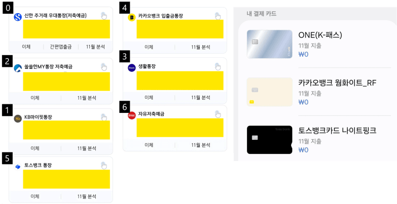 필요한 계좌 7개, 체크카드 4개, 신용카드 1개를 새로 세팅했습니다.