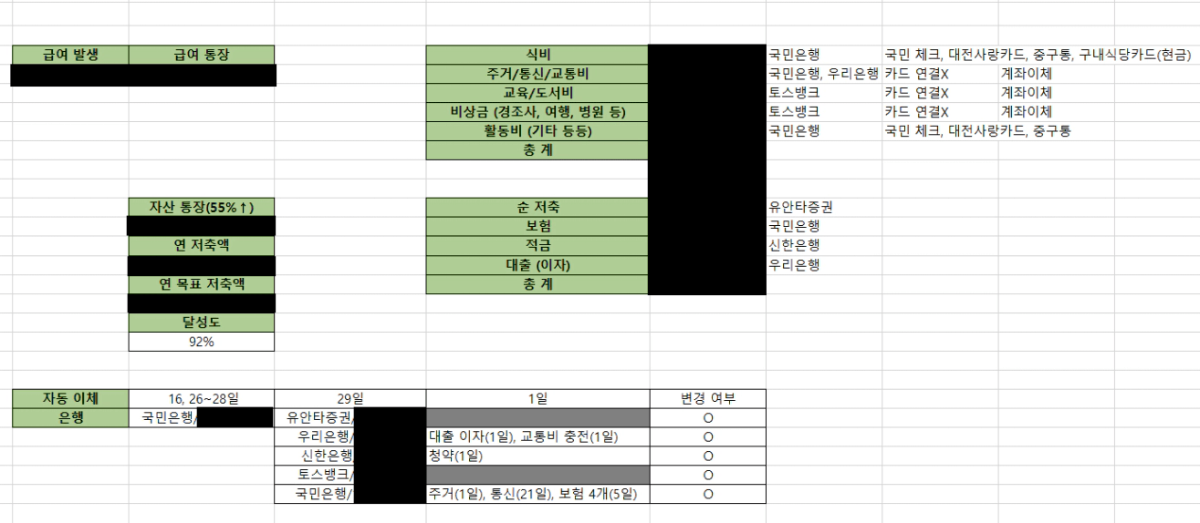 (나의 경우 식비, 주거/통신/교통비, 교육/도서비, 비상금, 활동비 이렇게 나눴다.)