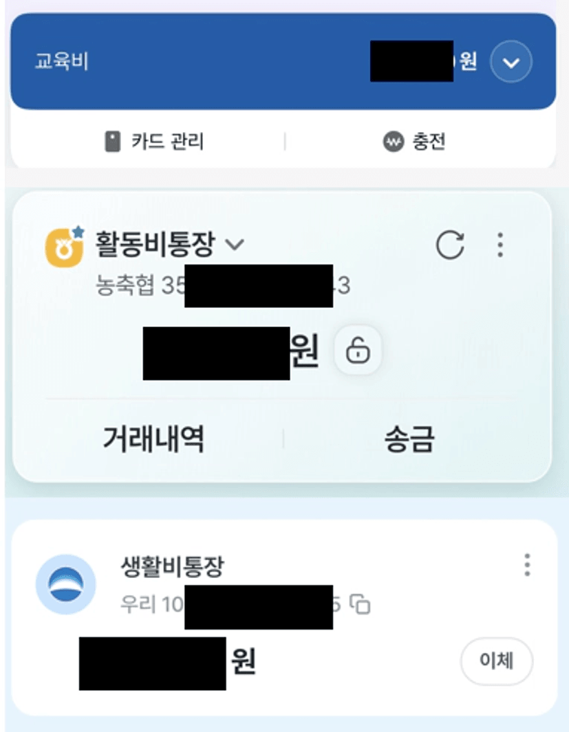 나눠서 생활비를 지출) 나중에 목표는 생활비와 활동비를 조금씩 줄여서 제 교육비로 넘길 생각입니다.