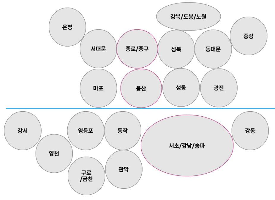 서울 25개구 및 경기 핵심지역까지 지도에 그려가면서