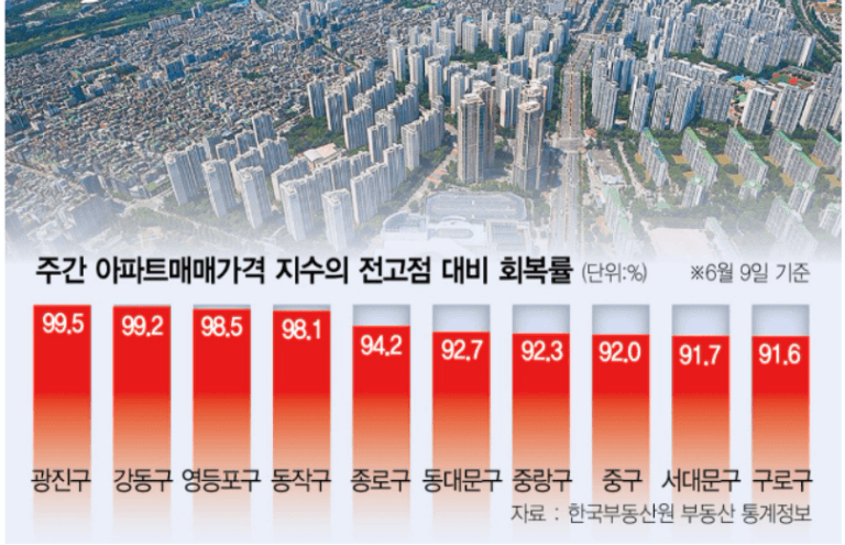 현재 서울의 가격은 상급지는 많은 비율이 전고점을 돌파했지만