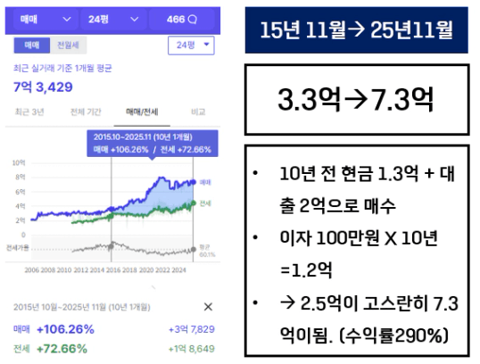 따라서, 실제로 제가 10년 동안 이 집을 사기 위해 산 비용은 현금 1.3억과 원리금 대출 1.2억인 총 2.5억 뿐입니다. 게다가 남은 주담대는 10년이란 시간동안 자연스럽게 인플레이션에 의해 줄어들어, 현재는 더 이상 부담스러운 대출금이 아닙니다.