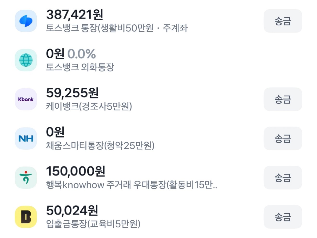 나머지는 자산통장(청년도약계좌, ISA, 연저펀)으로 월급날 당일에 바로 이체하고 있어요.