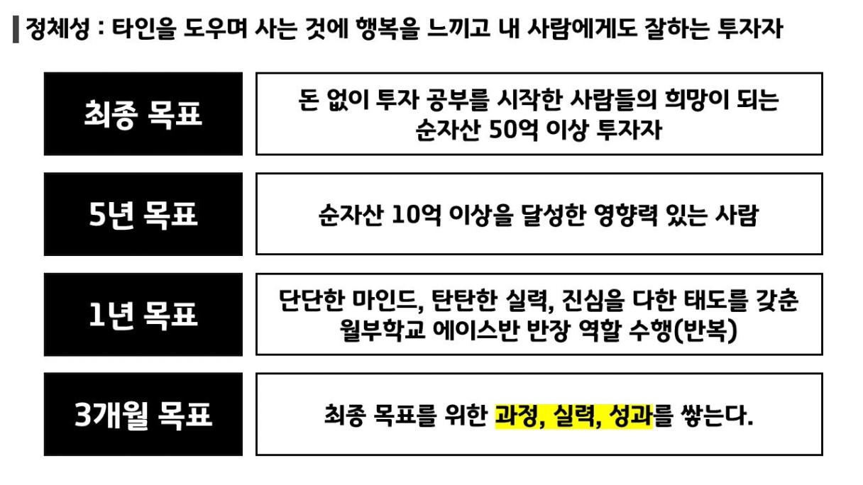 ✔️ 전체 목표, 3년 목표, 1년 목표, 3개월 목표를 이루기 위한 이번 달에 해야 할 일이 정리 되어야 한다.