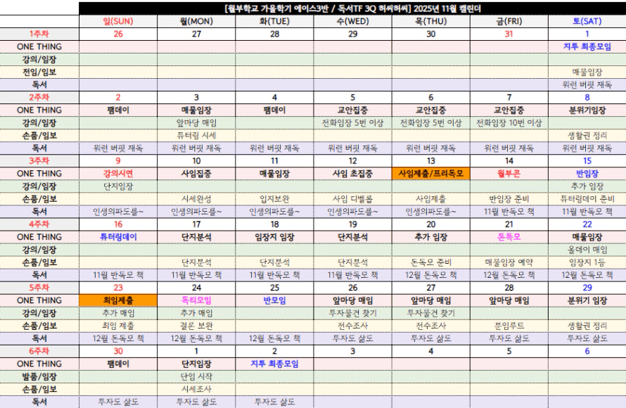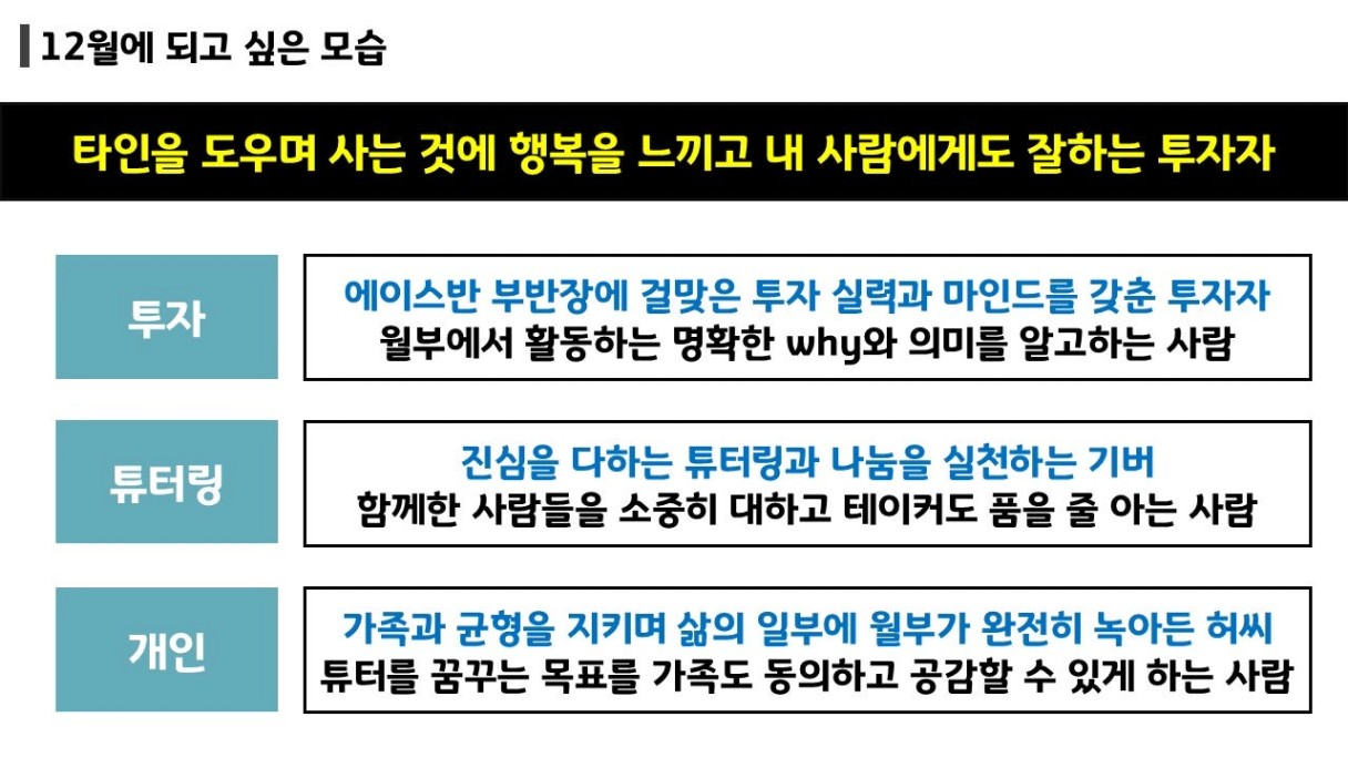 독강임투 : 양에서 질로! 독서는 5권 / 강의는 월학 + 지투 + 지기 / 임장 : OO구 + OO구, 임보 120p 내외 / 소액투자 물건 계속 찾기