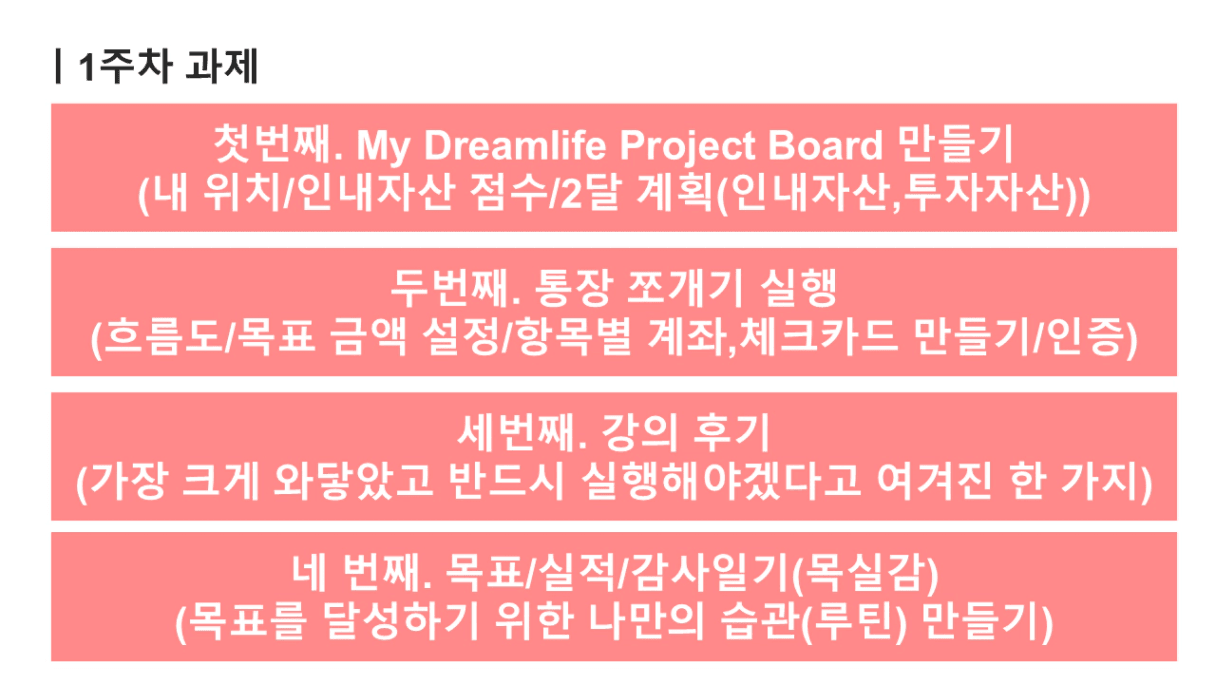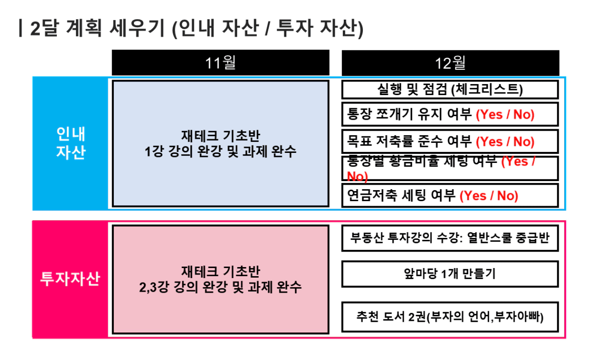 11월 재테기 강의 충실히 수강, 과제 충실히 작성, 제출한다. 그리고 통장쪼개기 생활에 익숙해진다.