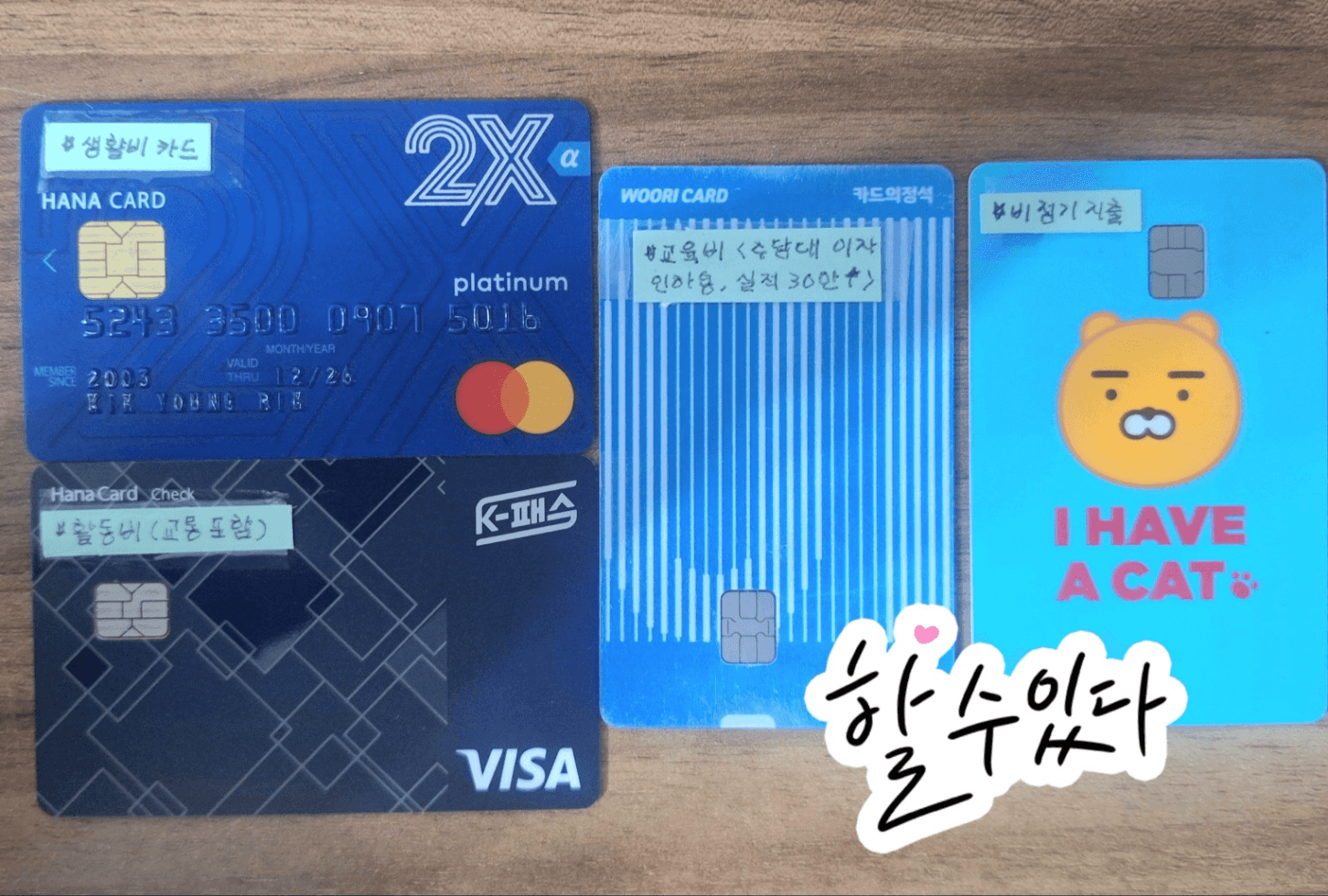 나위님이 친절하게 세팅해주신 데로 통장도 나눠보고, 용도별로 카드도 나누어보았습니다.