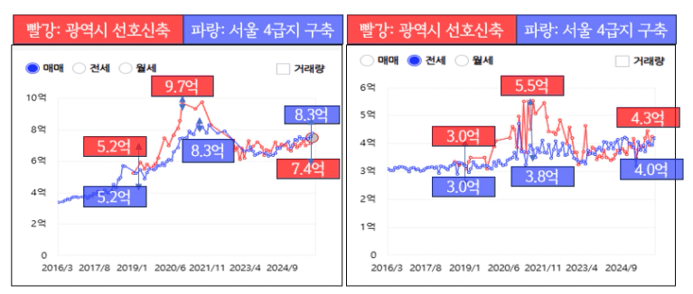 2025년 현재 파란단지 8.3억 (전고8.3)vs 빨간 단지7.4억(9.7)