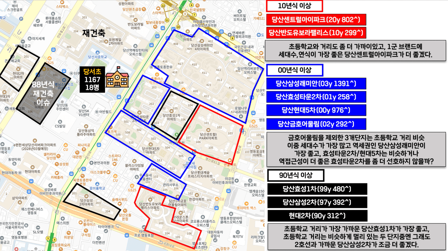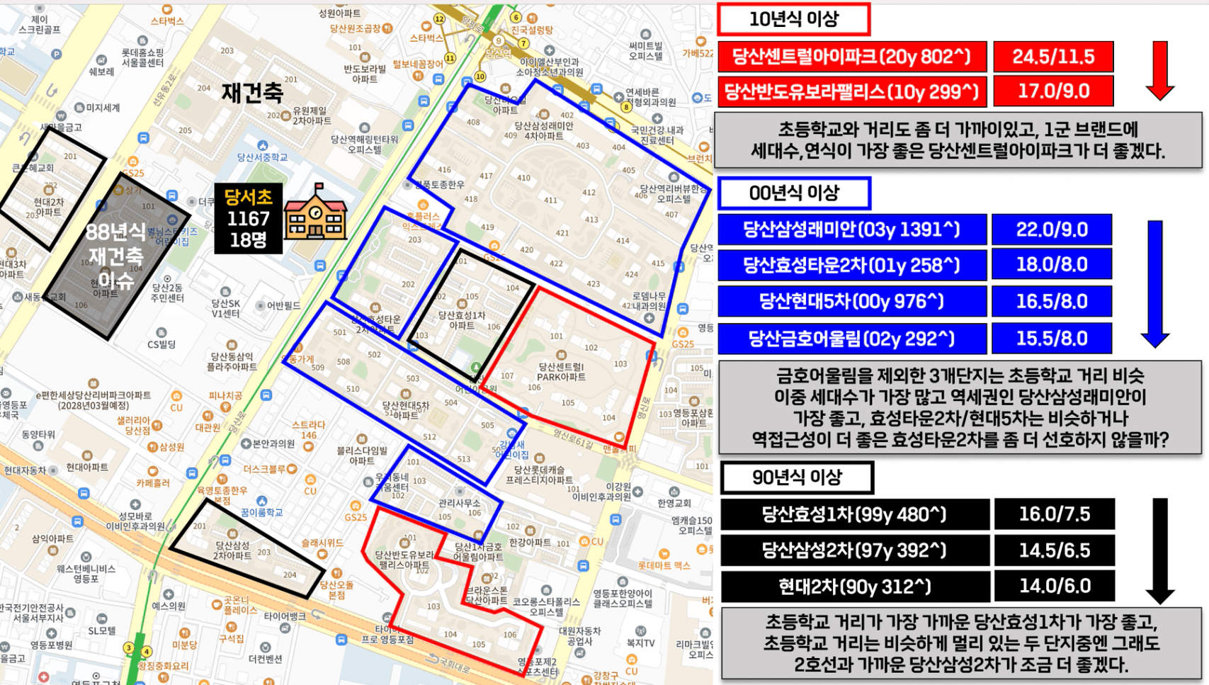 1등 생활권인 당서초 생활권안에서 연식으로 단지를 분류한뒤