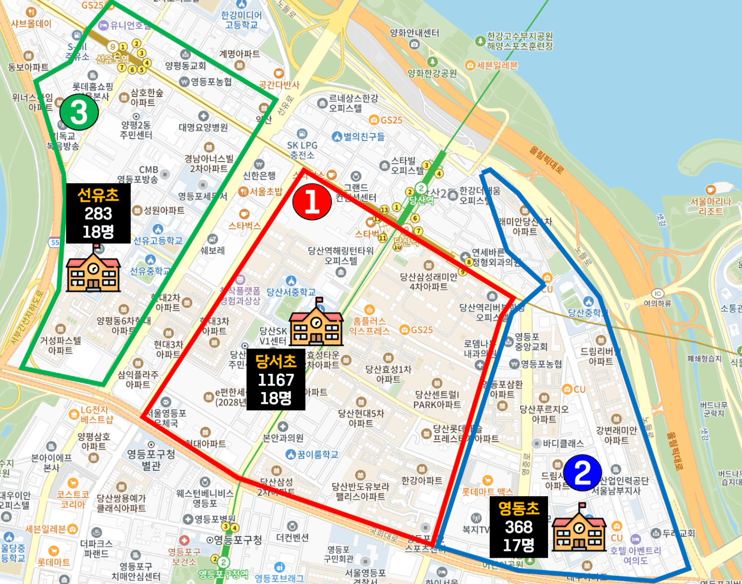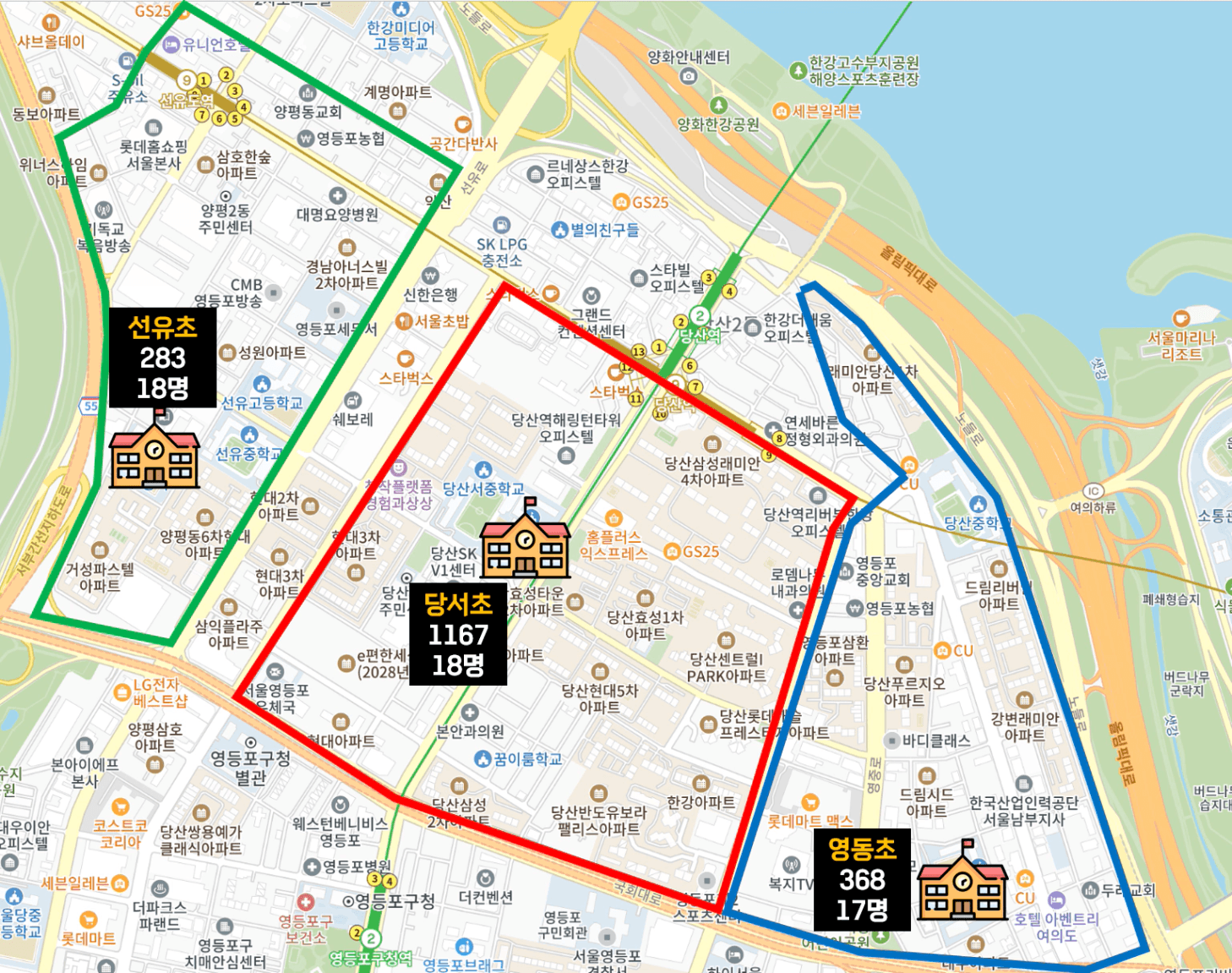 그리고 그 다음으로 영동초>선유초를 보내는 생활권으로 당산생활권 안에서의