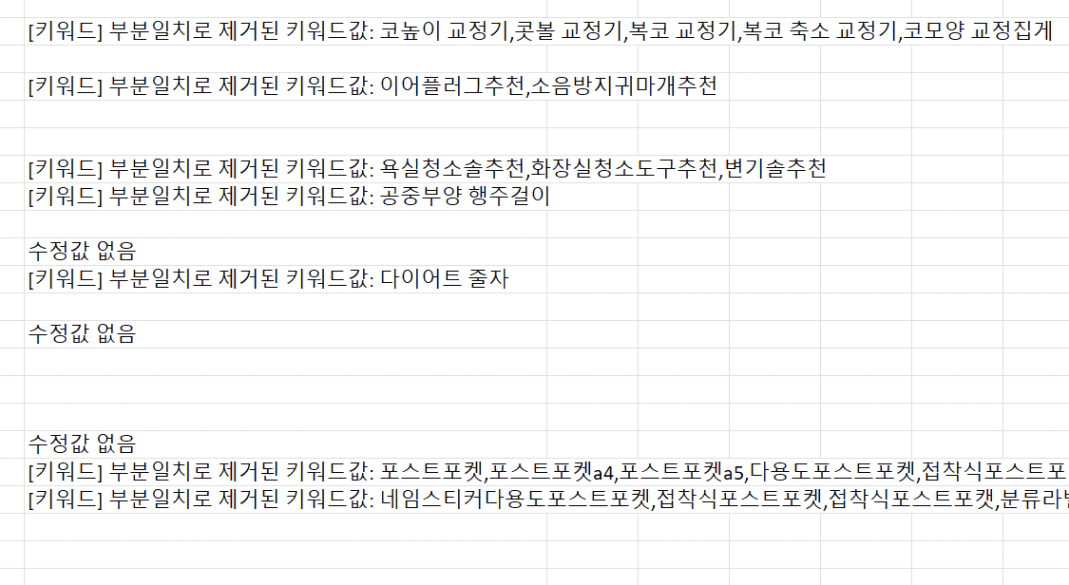 키워드 부분일치로 제거된 내용이 많은데 이럴떄는 키워드 입력을 다시 해서 엑셀 수정을 또 해야될까요?
