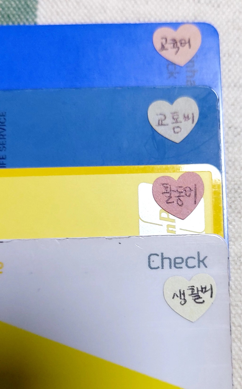 이렇게 네 가지 용도로 통장을 나누고, 각 카드에 하트 스티커를 붙여 시각적으로 구분했다.