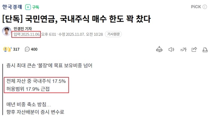 내용은 국민연금이 더 이상 대한민국 주식을 매수할 수 없으며 만약 추가로 상승하게 된다면 그 때 부터는 매도를 할 수 밖에 없다는 내용을 담고 있었습니다.