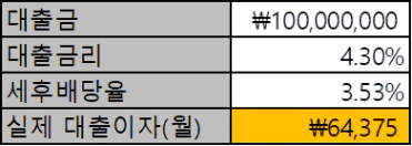 그렇다면 제가 실제로 1억 대출에 대해 내는 이자비용은 4.3% - 3.52%이므로 이것을 한 달로 계산해보면 약 6만원이 나옵니다.