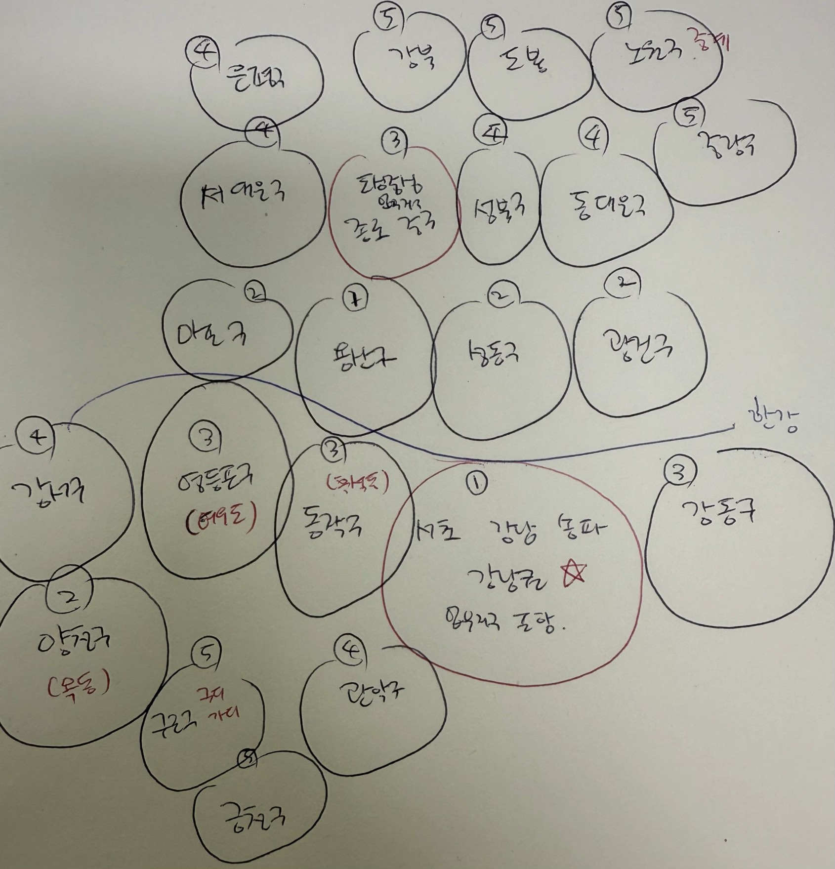 알고는 있었지만 강북쪽은 정말 위치가 생소한 지역들이 많더라구요. 주우이님이 그려주신 지도와 설명 보면서 혼자 그려보았는데 솔직히…강북은 조금 컨닝 했습니다. 오늘 내일 더 들어다 보겠습니다!