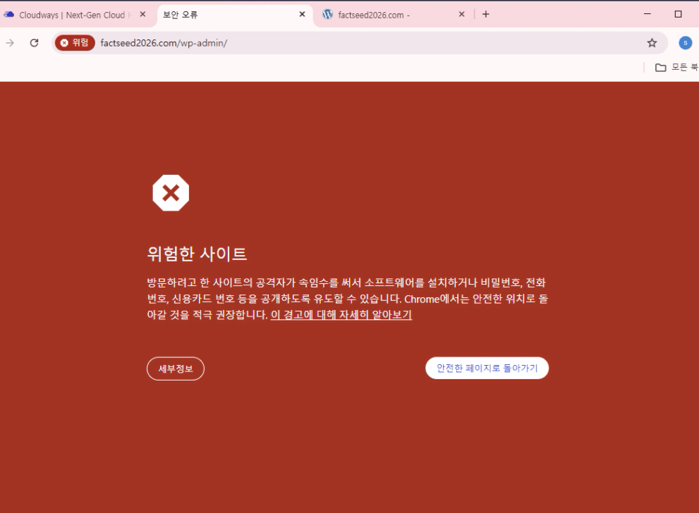 제목과 마찬가지로 클라우드웨이즈에서 내 어드민 패널로 가려고하면 아래와같은 보안오류가 뜹니다.