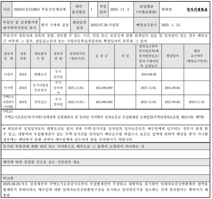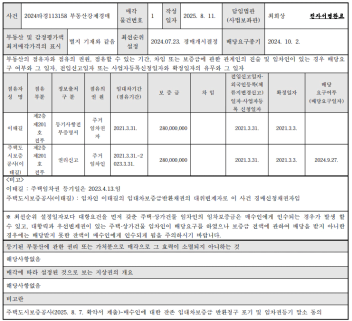 주택도시보증공사가 임차보증금에 대한 청구권을 포기하면서, 실제 낙찰자는 인수 부담이 전혀 없는 안전한 형태로 정리됐죠.