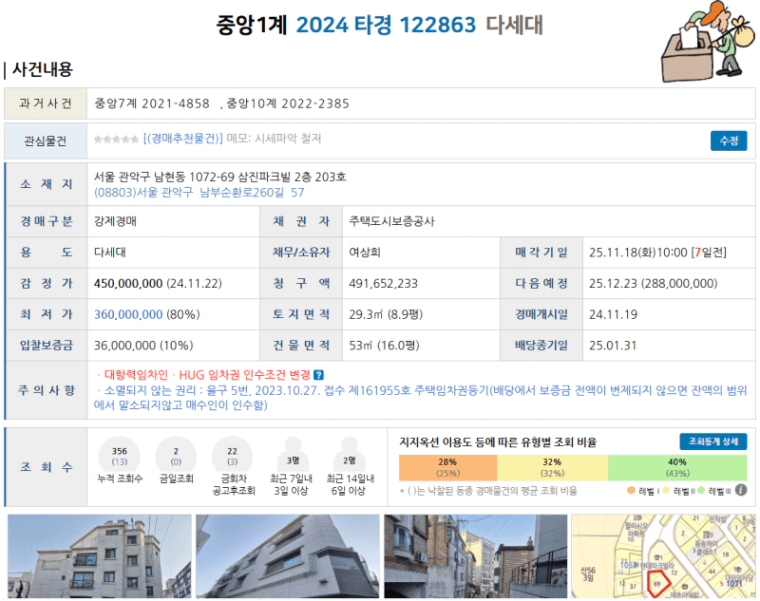 따라서 보증금 이하 낙찰이어도 매수인 인수 보증금 없고, 빈 집이라면 명도도 매우 쉬울 것으로 예상됩니다.