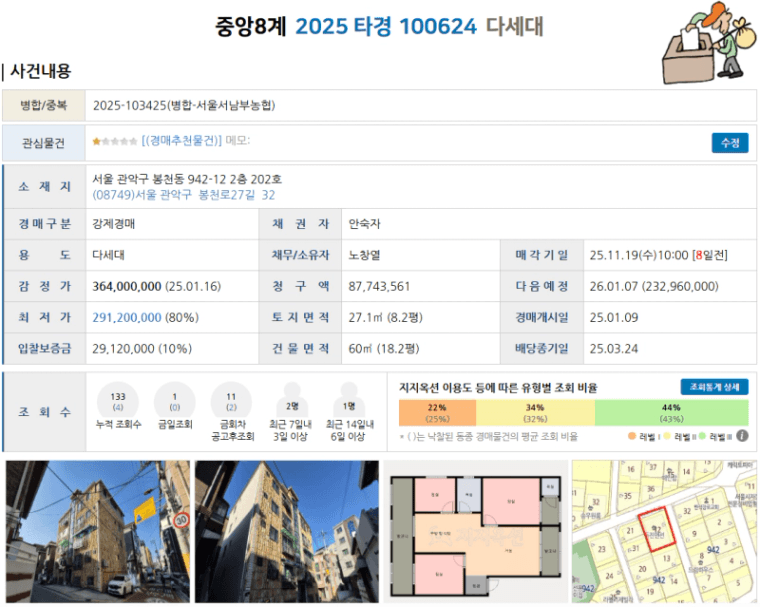pick 1. 중앙8계 2025타경100624 봉천동 다세대, 2회차 2억9천 진입 봉천역 341m 역세권 방3 화2 빌라!