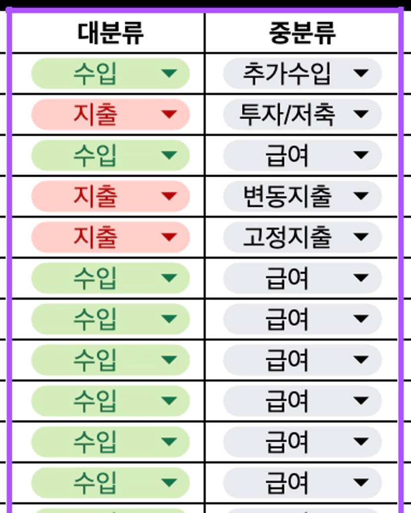 예를 들면 아래 이미지처럼, 대분류에서 수입/지출을 선택해야하죠.