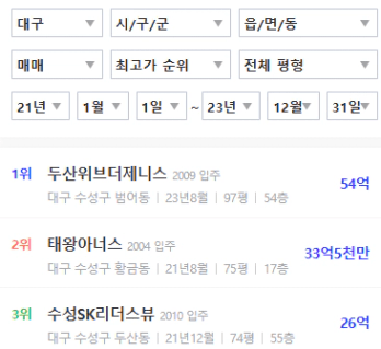 대구는 09년식 두산위브더제니스 99평형이 54억에 거래 되었습니다.