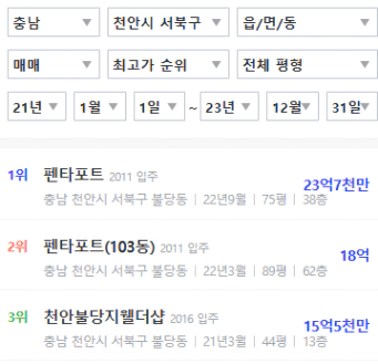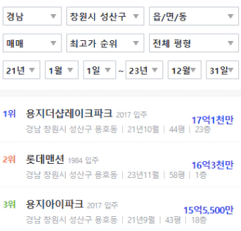 평형을 풀고 그 지역의 최고가 아파트를 비교하면