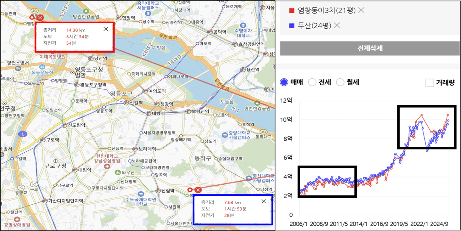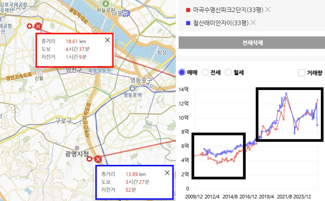 강남과의 물리적거리가 2배정도 차이가 나는만큼