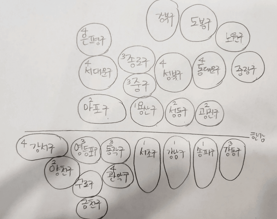 서투기 1주차 강의에서 서울 25개구와 경기도 핵심지역을 한 판에 정리해주셨습니다.