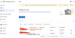 지금 A 지메일로 로그인한 구글 애드센스 홈페이지의 Sites 클릭했을 때 보여지는 내용입니다. 혹시 수정하는 방법을 알려주시는데 도움될까싶어서 올려요 :(