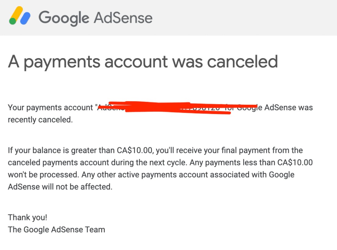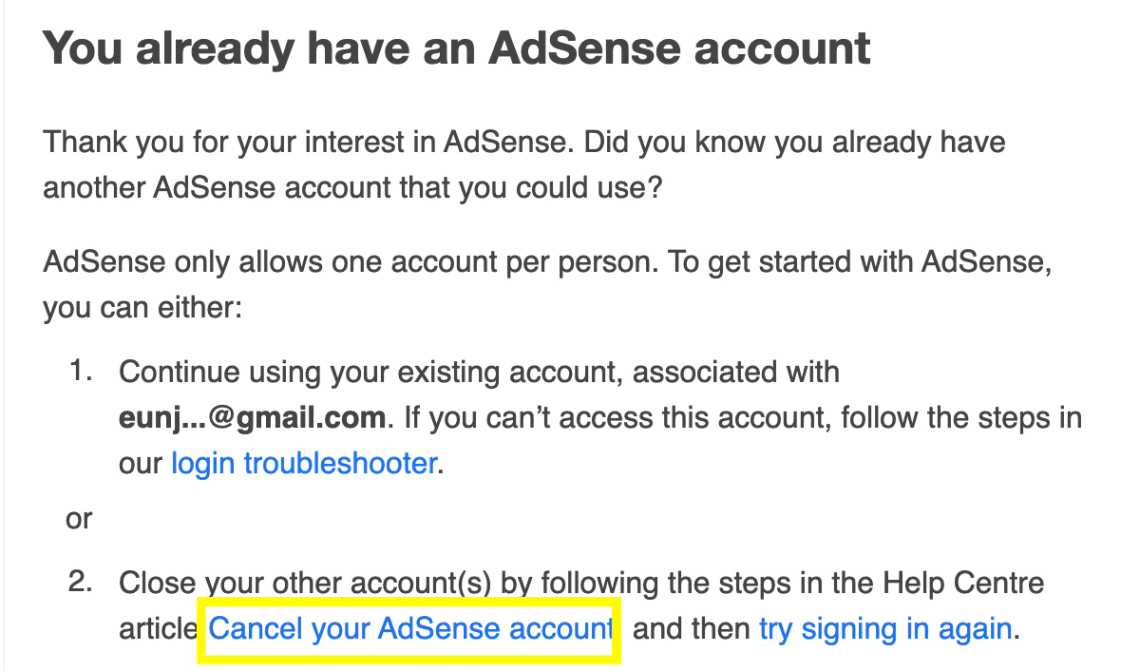 몇시간 전에 애드센스 신청을 했는데요, 비지니스용 다른 지메일로 구글 애드센스 계정이 중복되었다는 이메일을 받았습니다. 편의상 애스센스용으로 사용하는 이메일을 A, 비지니스용 이메일을 B 라고 표시할게요. 아래 메일은 B로 온 이메일이고, 노랑색 상자 안의 cancel your AdSense account 로 들어가서 B와 연동된 구글 애드센스를 해지 했다고 생각을 했습니다. 그리고 그 후에 비지니스용 이메일을 B 요기로 아래와 같은 이메일도 받은 상태입니다.