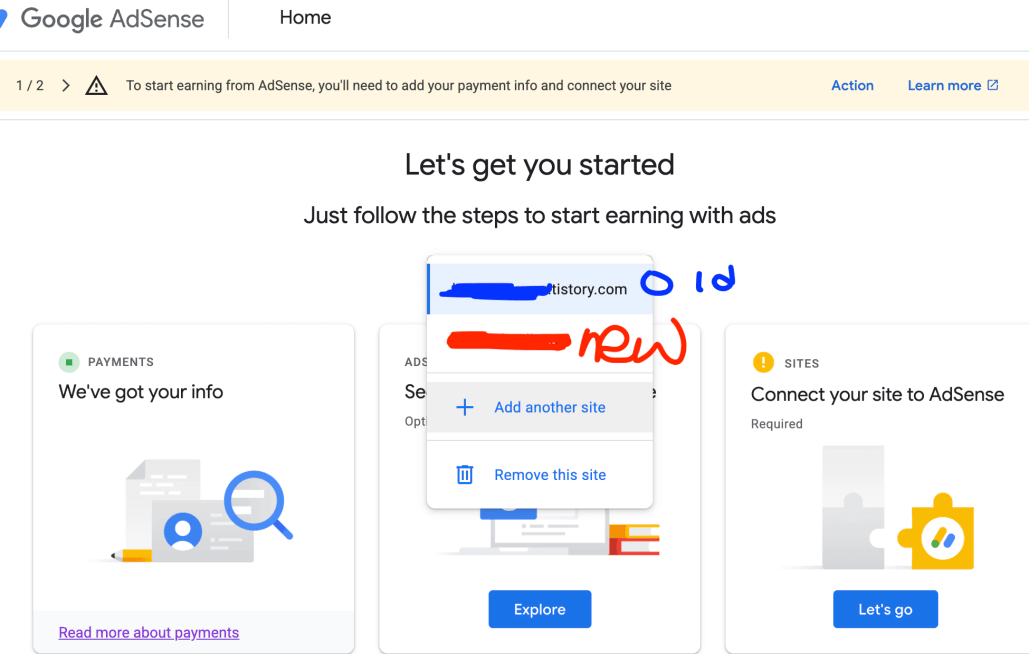 그리고나서 A 지메일로 구글애드센스를 들어갔는데 오래된 티스토리 계정이 보이더라구요 ㅜㅜ (아래 NEW 라고 표시된 도메인은 제가 수동으로 +Add another site로 새로운 도메인을 추가해뒀습니다)