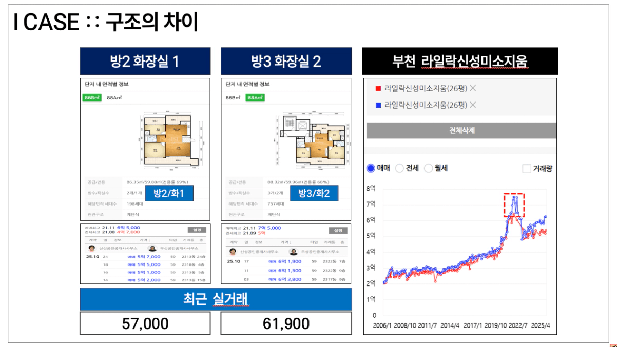 서울의 2급지인 성동구에 있는 서울숲한신더휴라는 아파트, 부천 원미구 상동에 있는 라일락신성미소지움이라는 아파트입니다. 같은 단지 안에서도 방과 화장실의 구성요소에 따라서 가격차이가 나는 것을 볼 수 있습니다. 선호가 다름에도 가격이 붙어있던 시기가 있었고, 그런 때라면 좋은 구조가 더 싸다는 것을 의미하기도 하는 것일겁니다.