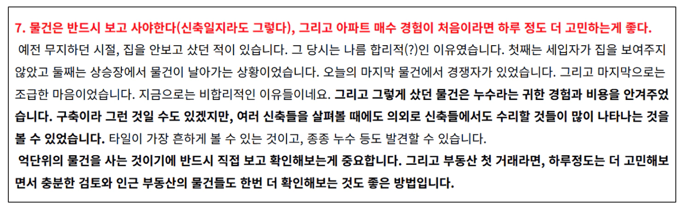 7. 물건은 반드시 보고 사야한다(신축일지라도 그렇다), 그리고 아파트 매수 경험이 처음이라면 하루 정도 더 고민하는게 좋다.